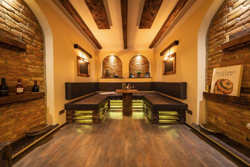 with 40 seats, open kitchen with wood-burning stove
